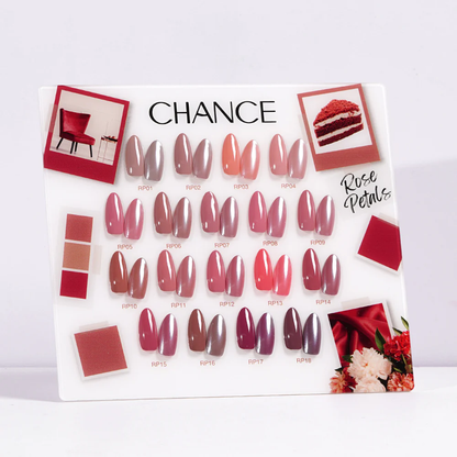 Romantic, polished, and always in demand. The Chance Rose Petals Collection #07 features 18 rose-inspired shades curated for flattering sets that feel elevated, from soft petal pinks and rosy nudes to deeper rose tones. Perfect for everyday elegance, special occasions, and client-favorite “pretty” sets that never miss.